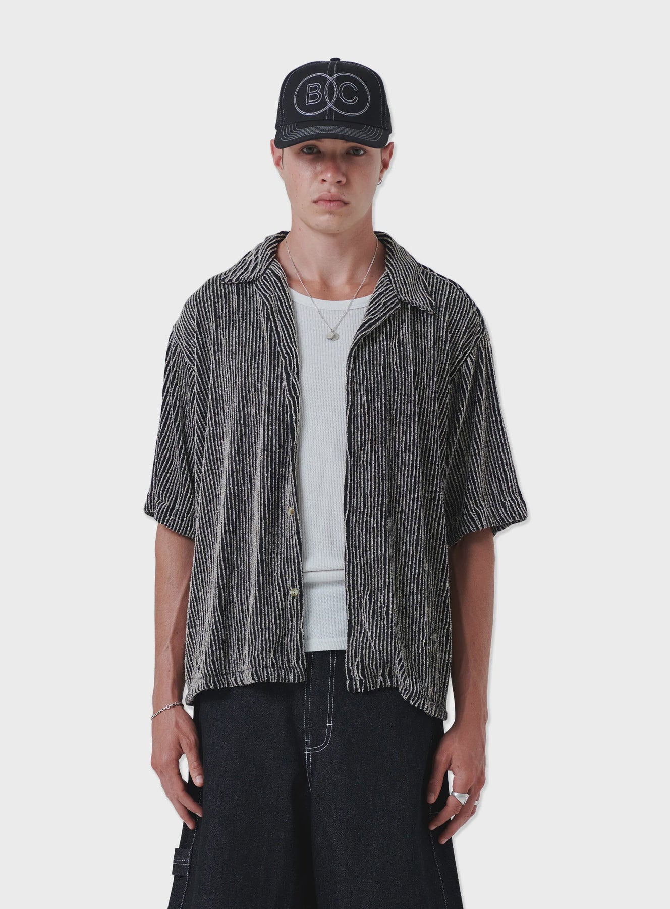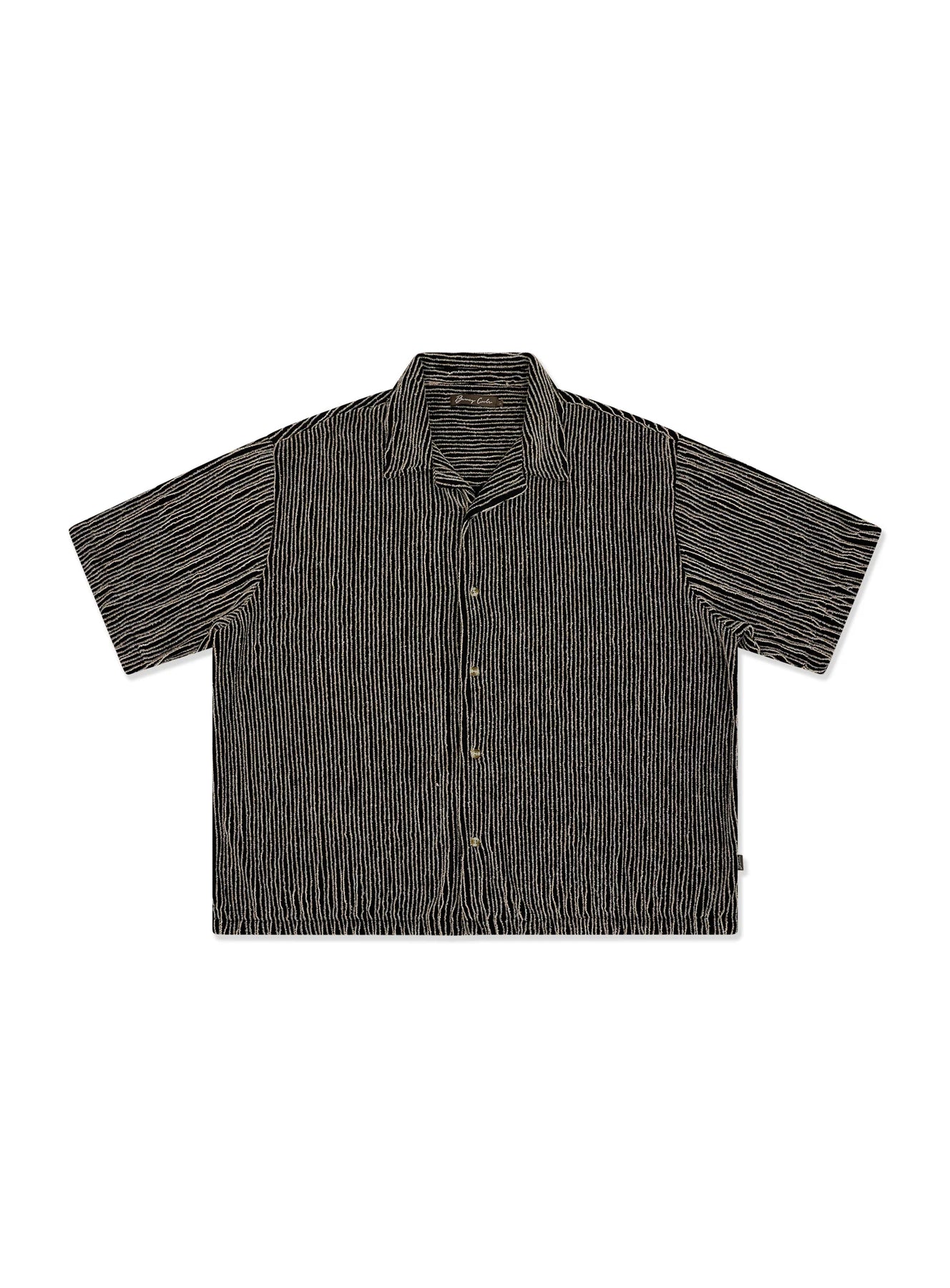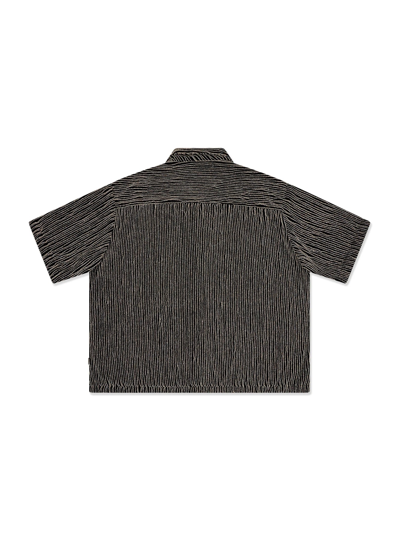 The Crop Shirt. Specialty textured fabric, resort collar and boxy fit. Length is shorter through body.