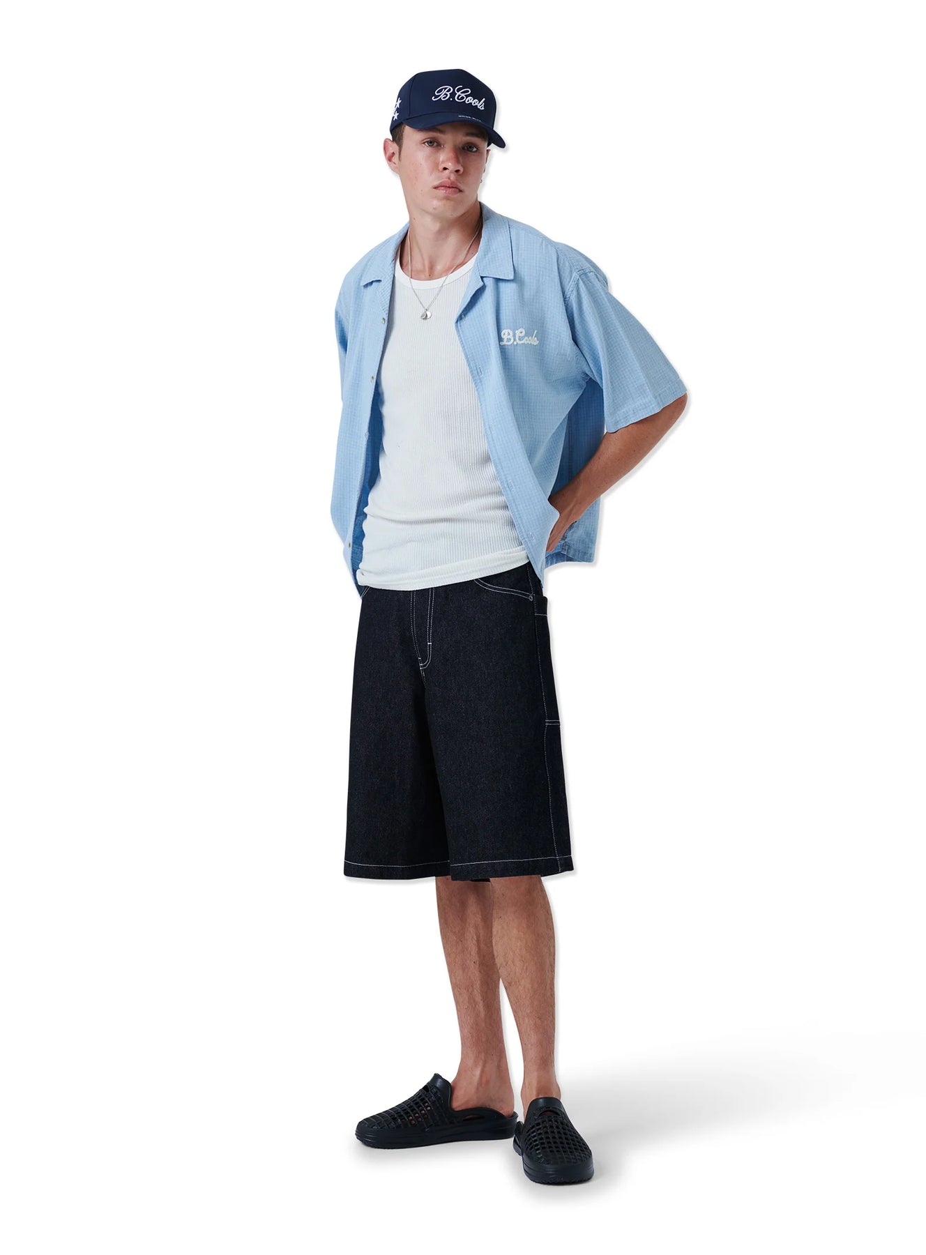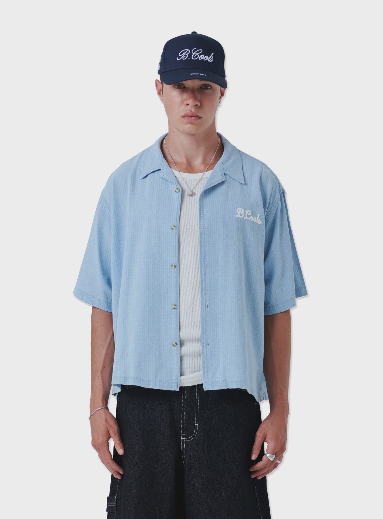 The Script Shirt in Blue. Lightweight cotton indigo fabric with subtle houndtooth fabric weave. Resort collar, boxy body and shorter length wth chest embroidery. Light bleach wash.