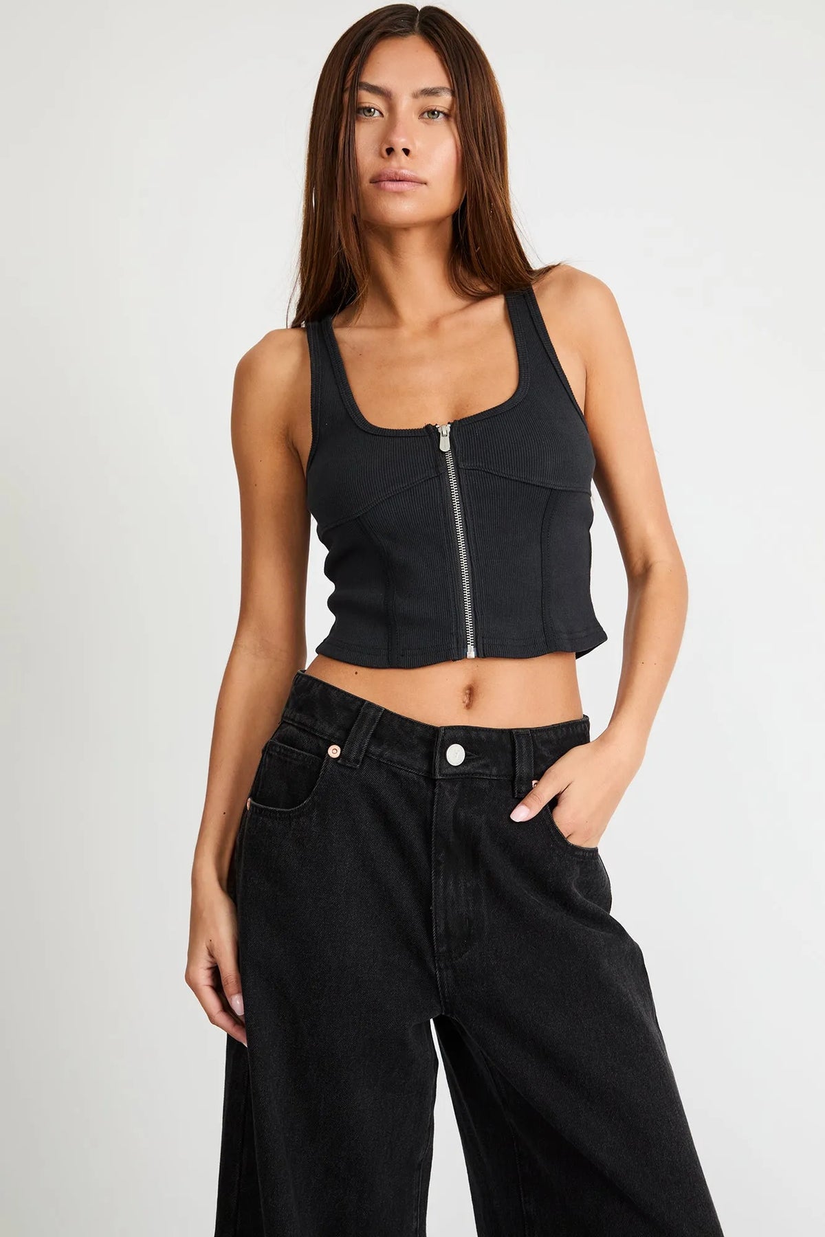 • Balance the volume with a fitted or tucked-in top. Think a baby tee and sneakers for everyday, or a knit and boots when you want to elevate the look