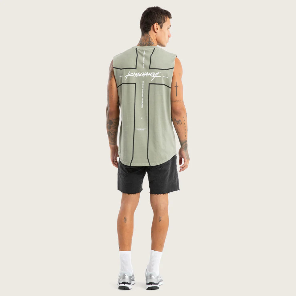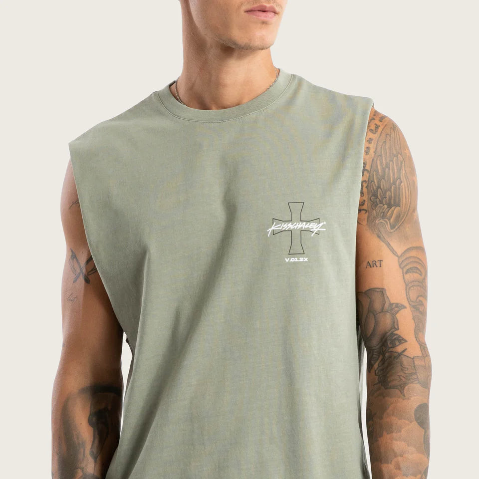 The Playback Dual Curved Muscle in Pigment Shadow features a slim fit in the body and arms, with a long length ending in a curved hem. Made from a blend of recycled cotton blend in a pigment-dyed finish.