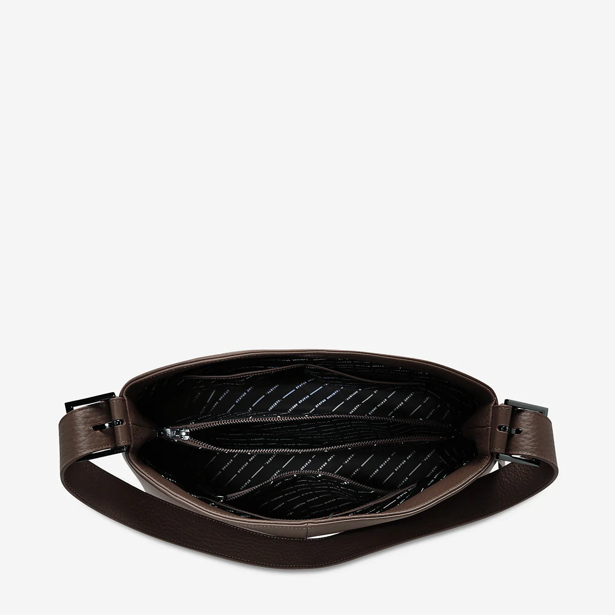 Built to handle almost any size impulse purchase, the 'Forget About It' bag has a magnet close top, an edgy angular silhouette, and branded strap buckles.