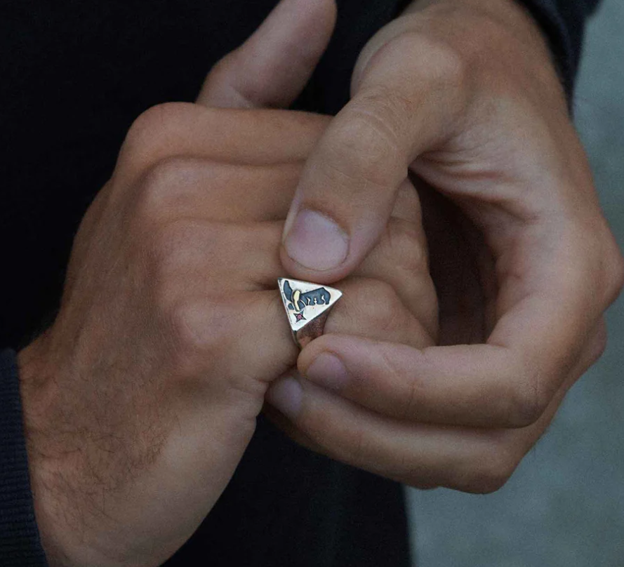 The Howdy Signet Ring features a 14.4mm x 15.3mm triangle face set with a brass buckle and 1.5mm garnet gemstone spur, cast in 925 sterling silver.