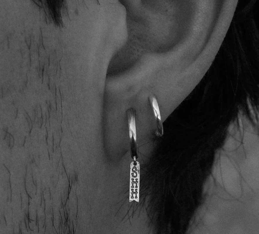 The Shh Huggie Earring features 2.5mm x 11mm ribbon charm with SHH engraving on a 10mm huggie earring, cast in 925 sterling silver.