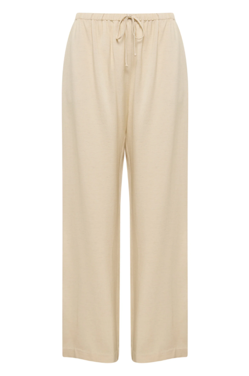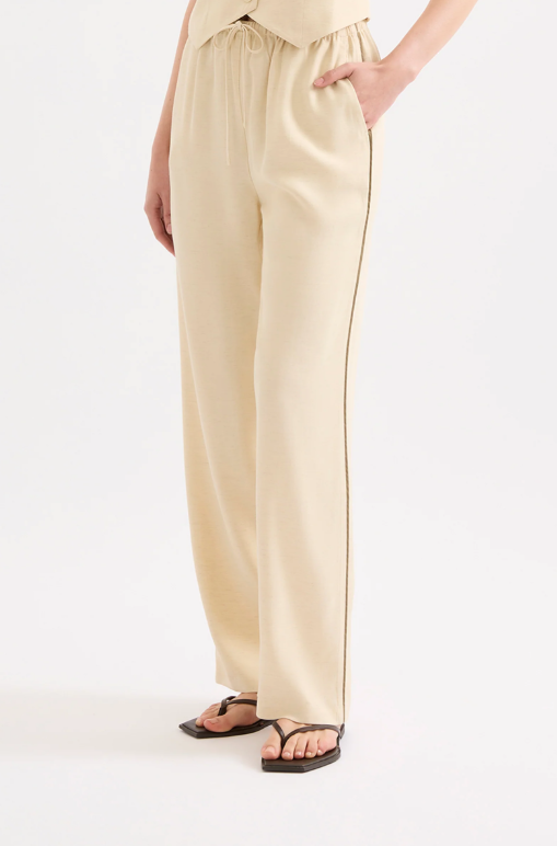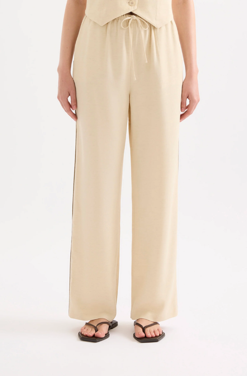 The Garcia Pant is made from a viscose blend fabrication which has a dry hand feel and a slub linen yarn throughout giving a light speckled appearance. The silhouette is relaxed with a wide full length leg. Features include an elasticated waistband with an external draw cord and contrast piping down side seams.