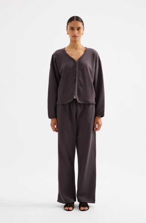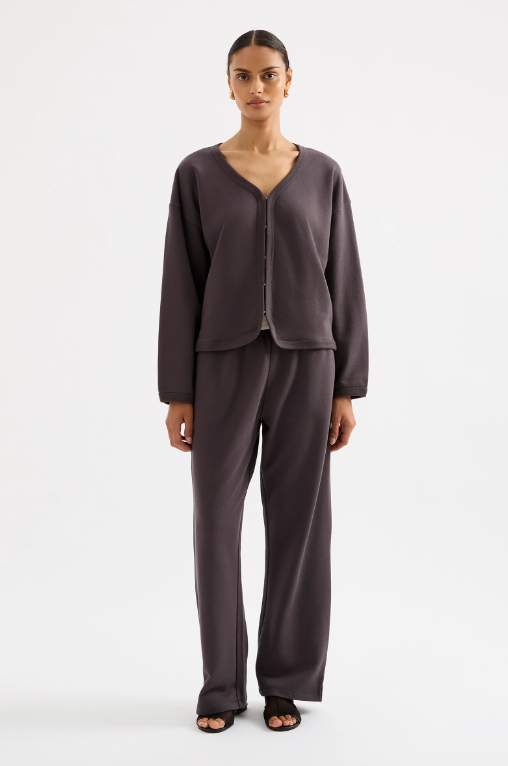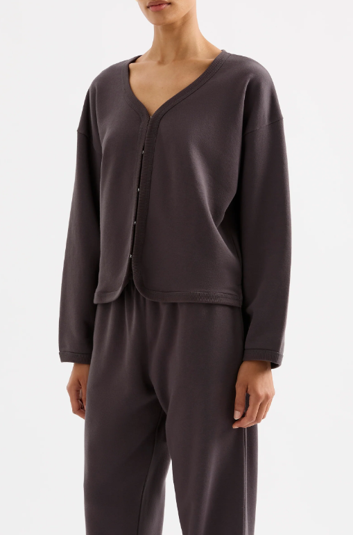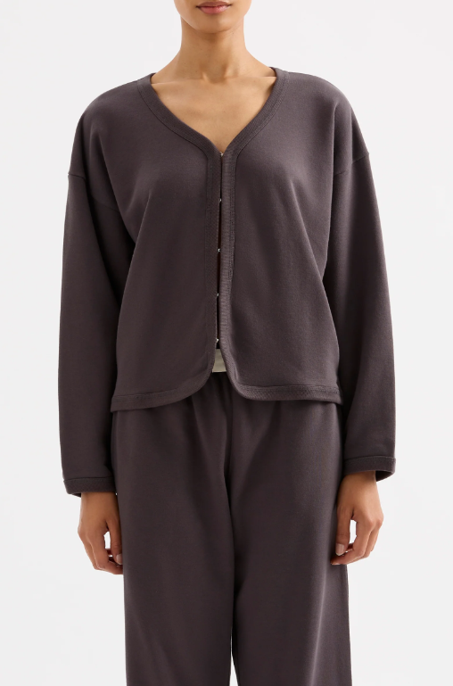 The Lounge Fleece Cardigan is made from organic cotton fleece which has an ultra soft hand feel. The silhouette is relaxed with a drop shoulder and length finishing above the hips. Features include long sleeves and hook and eye opening at centre front.