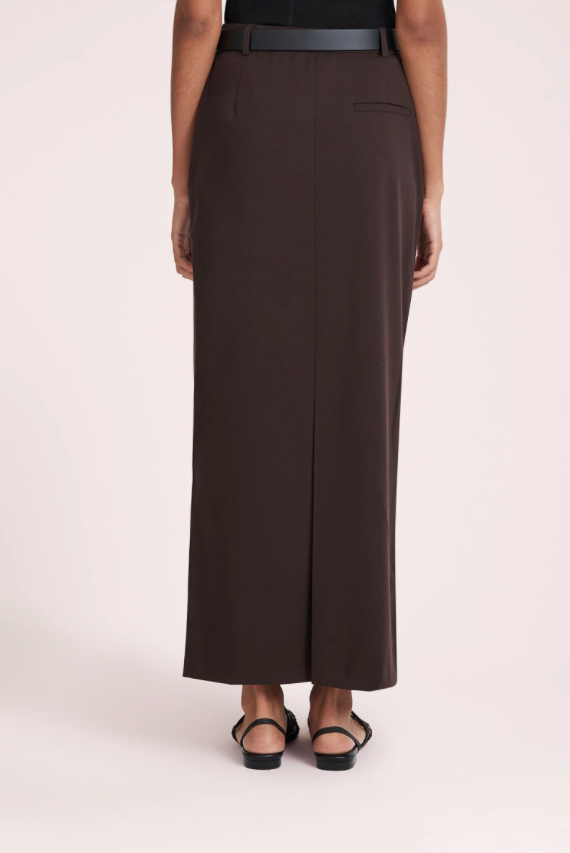 The Marlon Skirt is made from a classic wool blend suiting fabrication with a smooth hand feel. The silhouette is straight, mid rise with length finishing above the ankles. Features include trouser hook closure, side seam pockets and vent at the back.