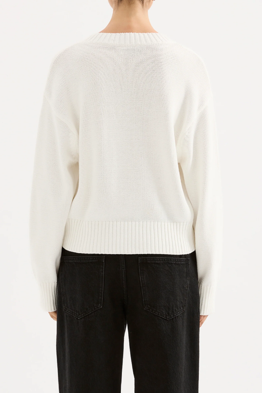 The Tara Knit is made from a midweight cotton yarn which has a solid, dry hand feel. The silhouette is relaxed with drop shoulder and long sleeves. Features include a v-neckline and rib at neckline, hem and sleeve cuff.
