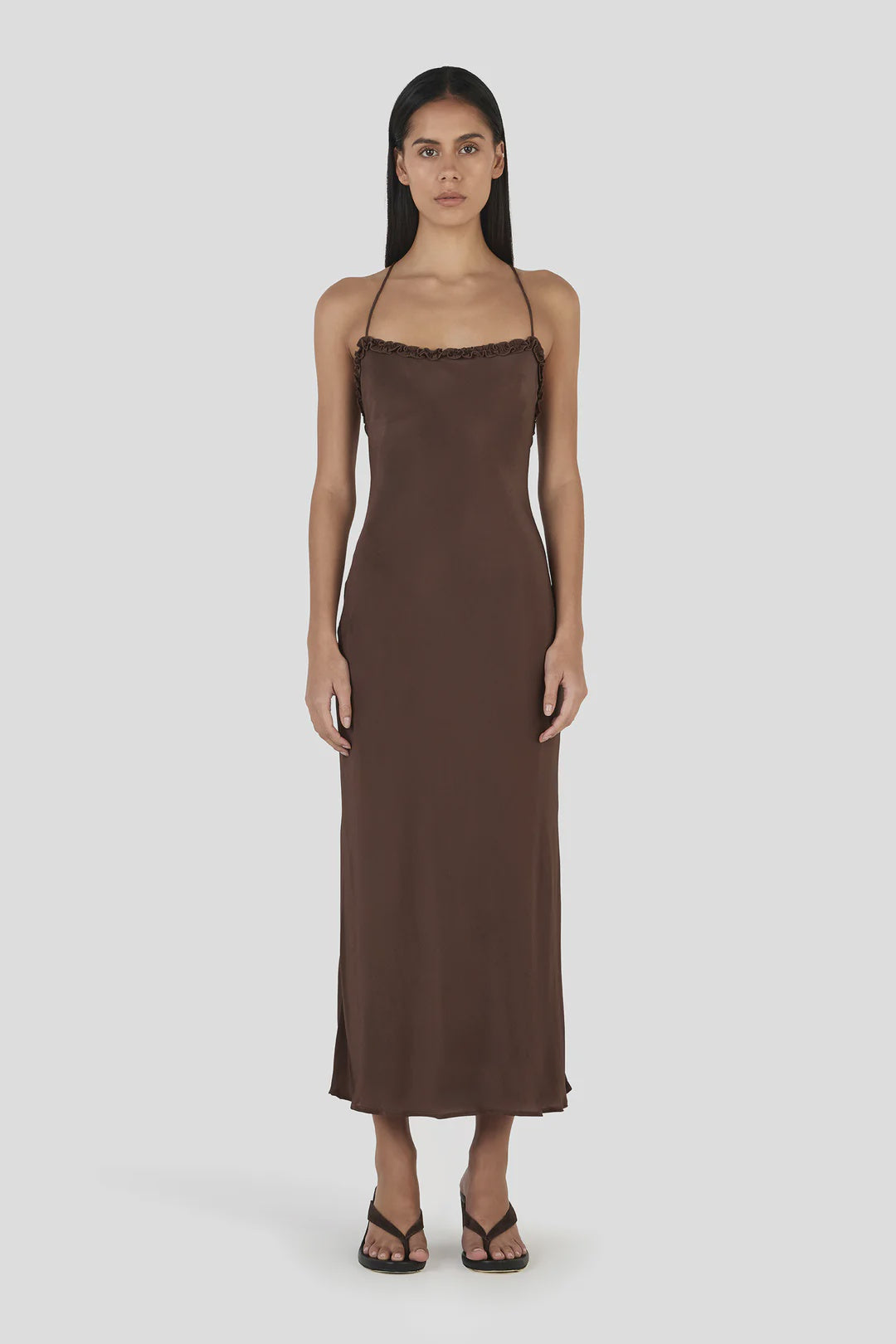 The Samantha Midi dress is a bias cut midi dress with a sweetheart neckline and ruffle trim. The dress has a flattering low back and is fully lined for coverage and a sleek silhouette.