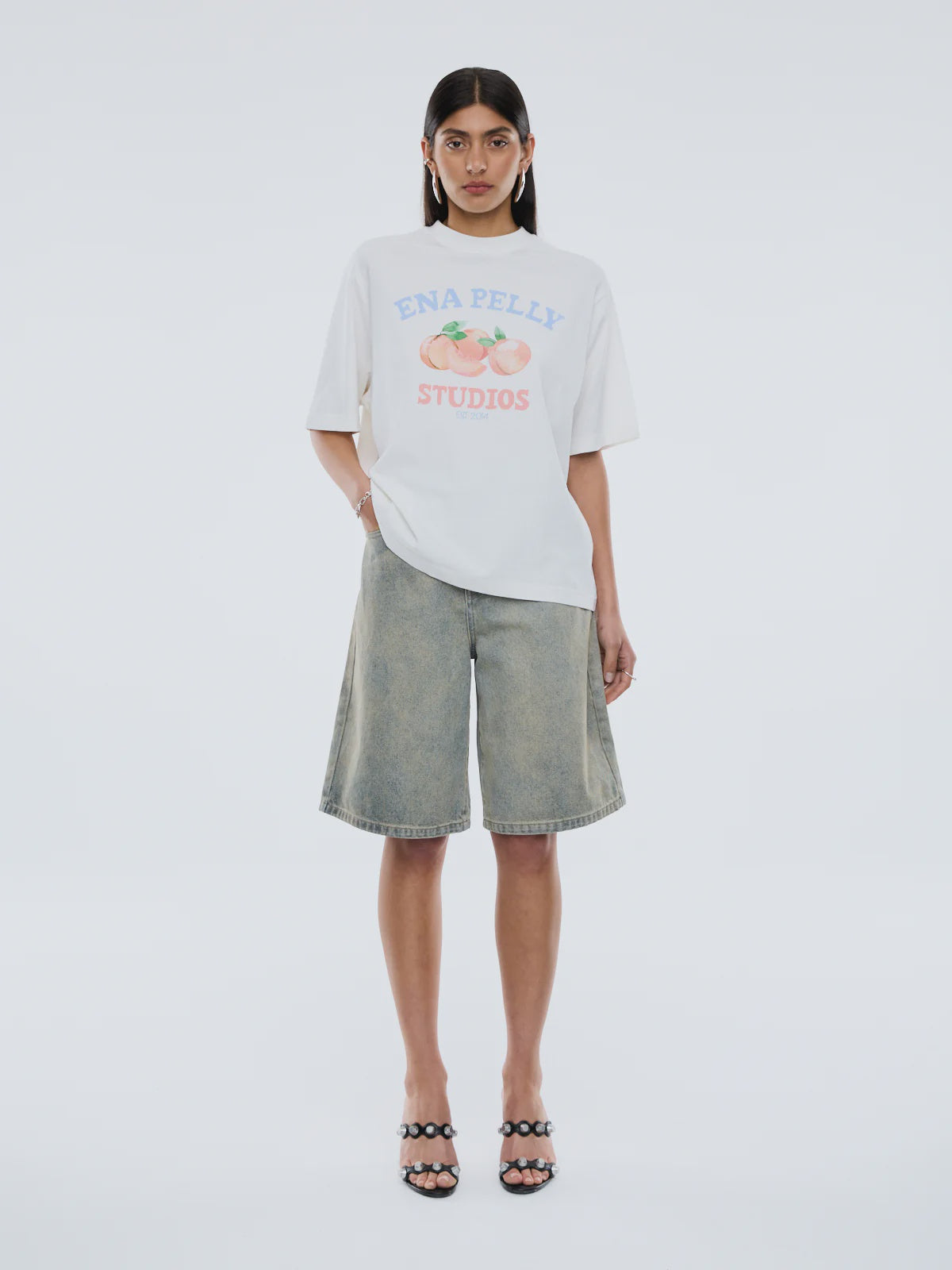 The Peaches Tee is crafted from cotton in vintage white with a relaxed, easy fit and short sleeves. Finished with a playful fruit-inspired water based print that brings joyful summer energy.