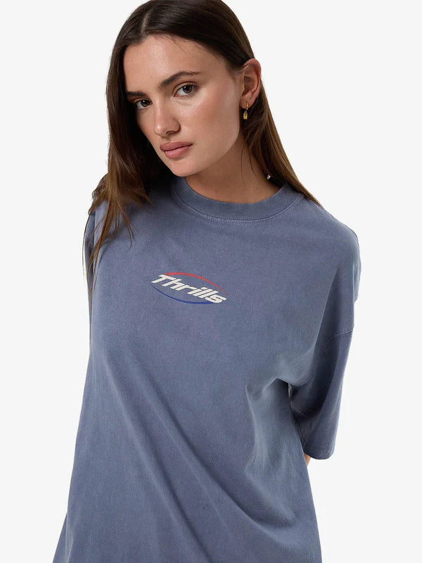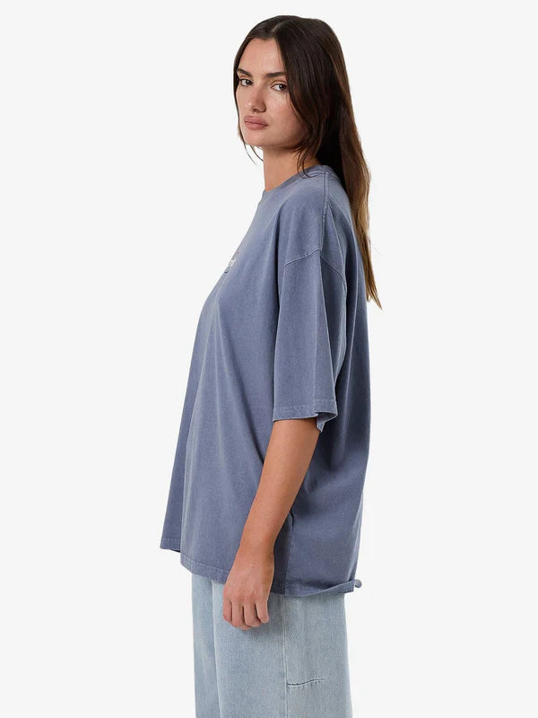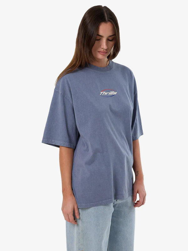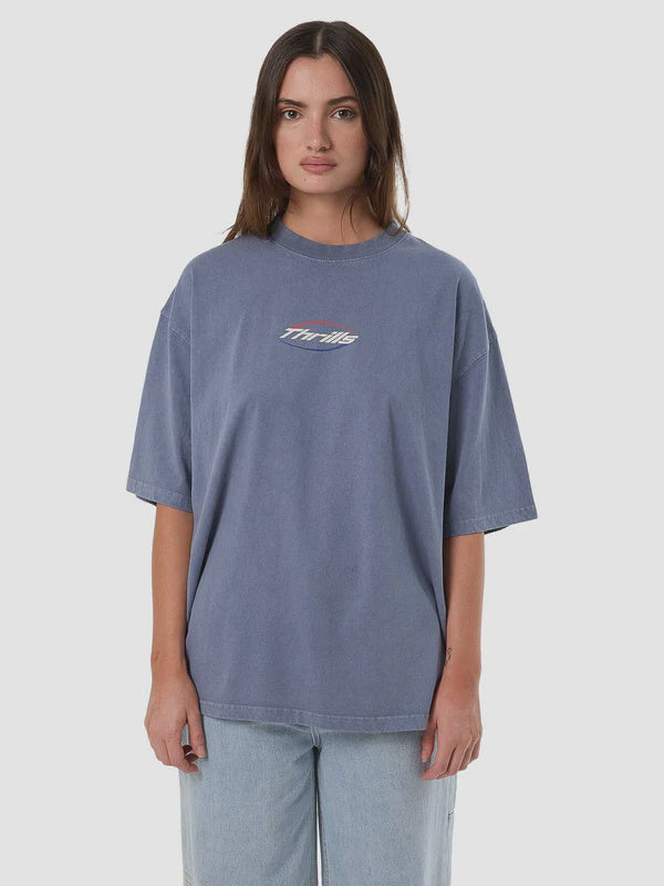 Relaxed, effortless, and built to last, the Fortune Favours Oversized Tee in Rustic Blue is all about effortless attitude and off-duty comfort. Designed in a relaxed, oversized women’s T-shirt fit, it offers extra room through the body and drop shoulders for that slouchy, borrowed-from-the-boys feel and vibe. Made from heavyweight 200gsm dry hand cotton jersey, this graphic women’s tee delivers structure and durability while still keeping it super soft and breathable for everyday wear. The washed-out colourway with thick crew neckline gives it a vintage edge, while the minimalist Thrills logo across the chest keeps the look clean and timeless. Whether you’re pairing it with denim jeans or baggy cargo shorts, this casual streetwear top nails the perfect balance between comfort and style. It’s easy to dress up or down, depending on your vibe and mood. The Fortune Favours tee is a quiet standout—authentic, understated, and made to be an all-around favourite.