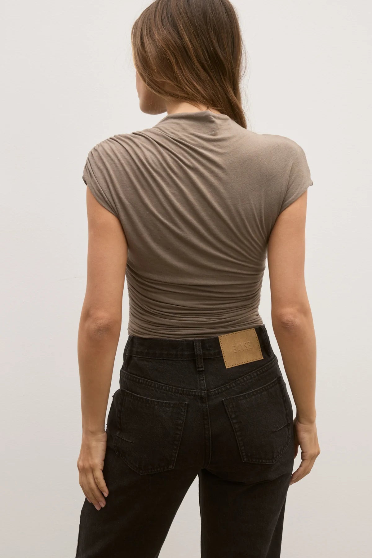 The Astrid Bodysuit is a modern essential that blends sleek minimalism with refined detail. Crafted from a soft stretch jersey, it features delicate ruching throughout to create a smooth, flattering fit. The high neckline and cap sleeves offer a sophisticated silhouette, while the bodycon cut contours effortlessly to the figure.