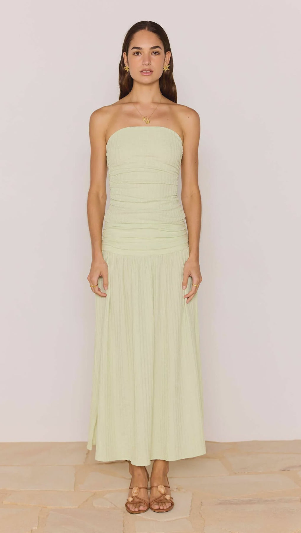 The Chloe Pistachio Strapless Ruched Top brings a fresh, flirty energy to your summer wardrobe. Designed in a soft pistachio hue, this fitted bandeau top features flattering ruching throughout the bodice for a figure-hugging silhouette that stays comfortable all day (or night). Made from a stretch blend for the perfect fit, it’s fully lined for a smooth finish and pairs perfectly with the matching Chloe Maxi Skirt.