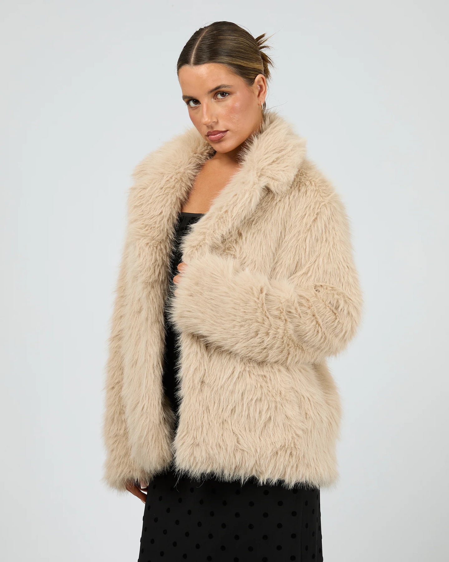 Embrace winter elegance with the Angela Fur Coat. This luxurious beige faux fur jacket offers both warmth and sophistication with its plush texture and relaxed silhouette. Perfect for evening events or casual outings, it instantly elevates any ensemble with effortless glamour.