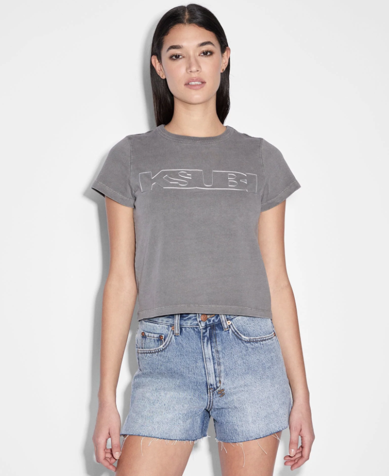 The Alloy Sott Mini Tee Vintage Grey is constructed from premium cotton jersey that has been overdyed and then washed back for a vintage look. This style is a shrunken, boxy t-shirt with a crew neck and cap sleeves. Finished with exclusive metallic silicone 'Sign of the Times' print and Ksubi branding.