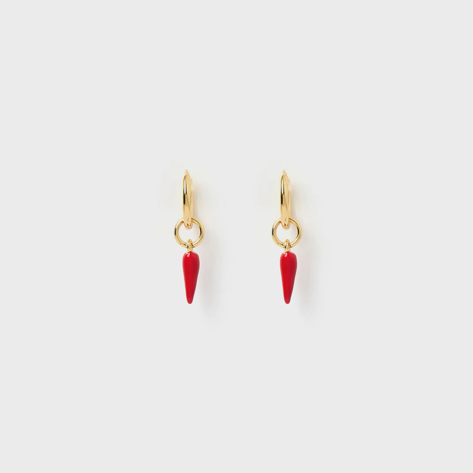 Made for stacking and playful style, our Cornicello Red Charm Earrings are here to add some golden spice to your everyday stack! Representing the Cornicello, this gold horn charm is very lucky and is believed to protect its wearer. The Cornicello charm is available in large and small sizes and is perfect for stacking.