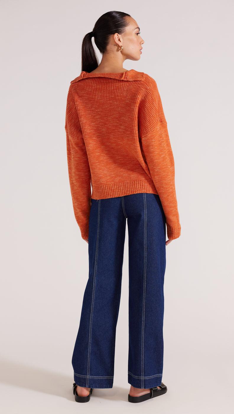 Crafted in a warm and vibrant orange hue, the Derby Jumper features a collared V-neckline, drop shoulders, and a half-rib knit design for a textured look. The jumper is finished with rib cuffing and hemline and a relaxed shape for ultimate comfort.