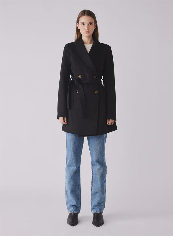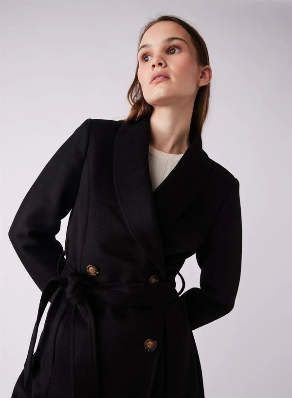 • Lux wool blend fabrication• Roll collar• Double breasted button opening• Long sleeve• Removable waist tie• Side slit pockets• Thigh length• Fully lined