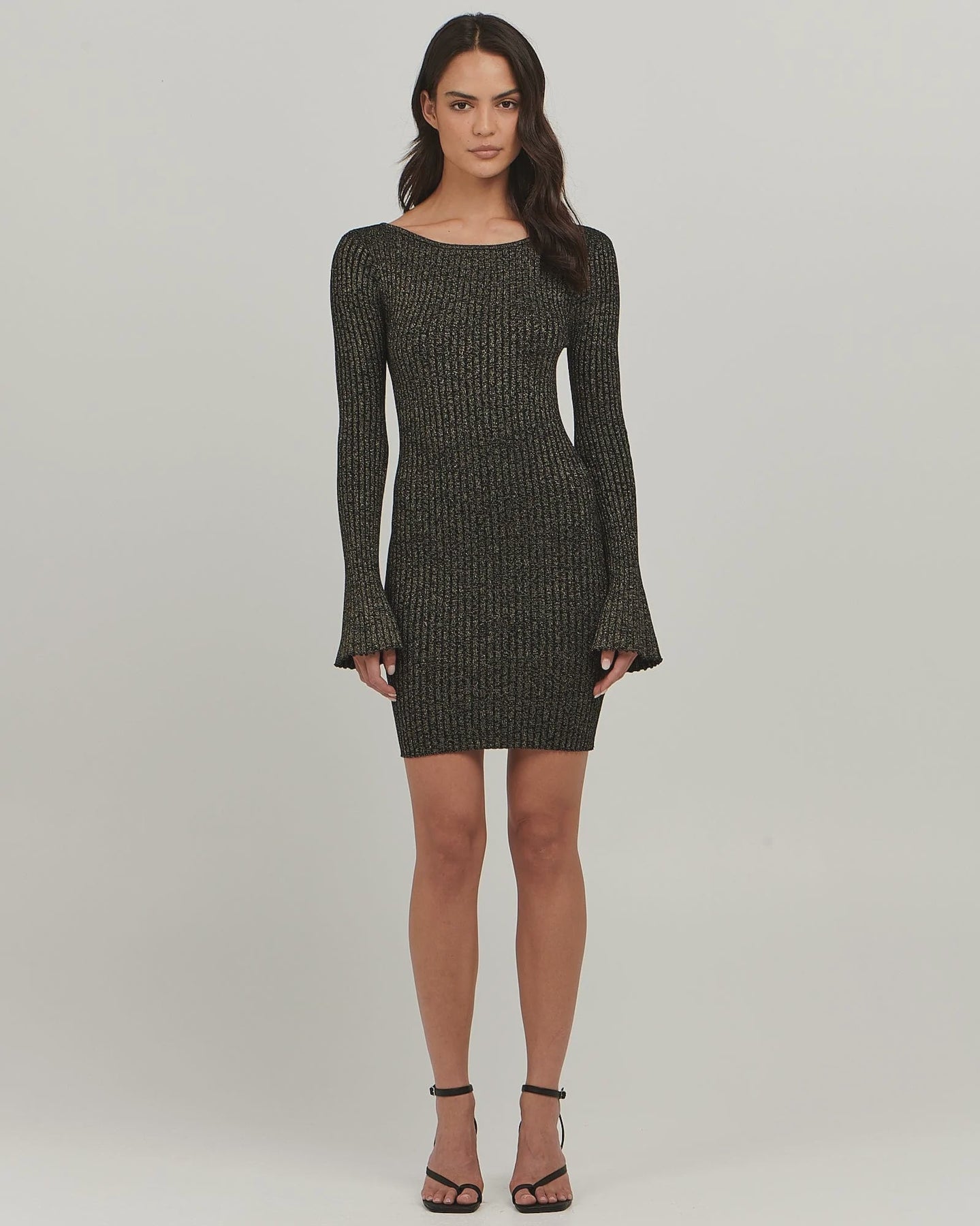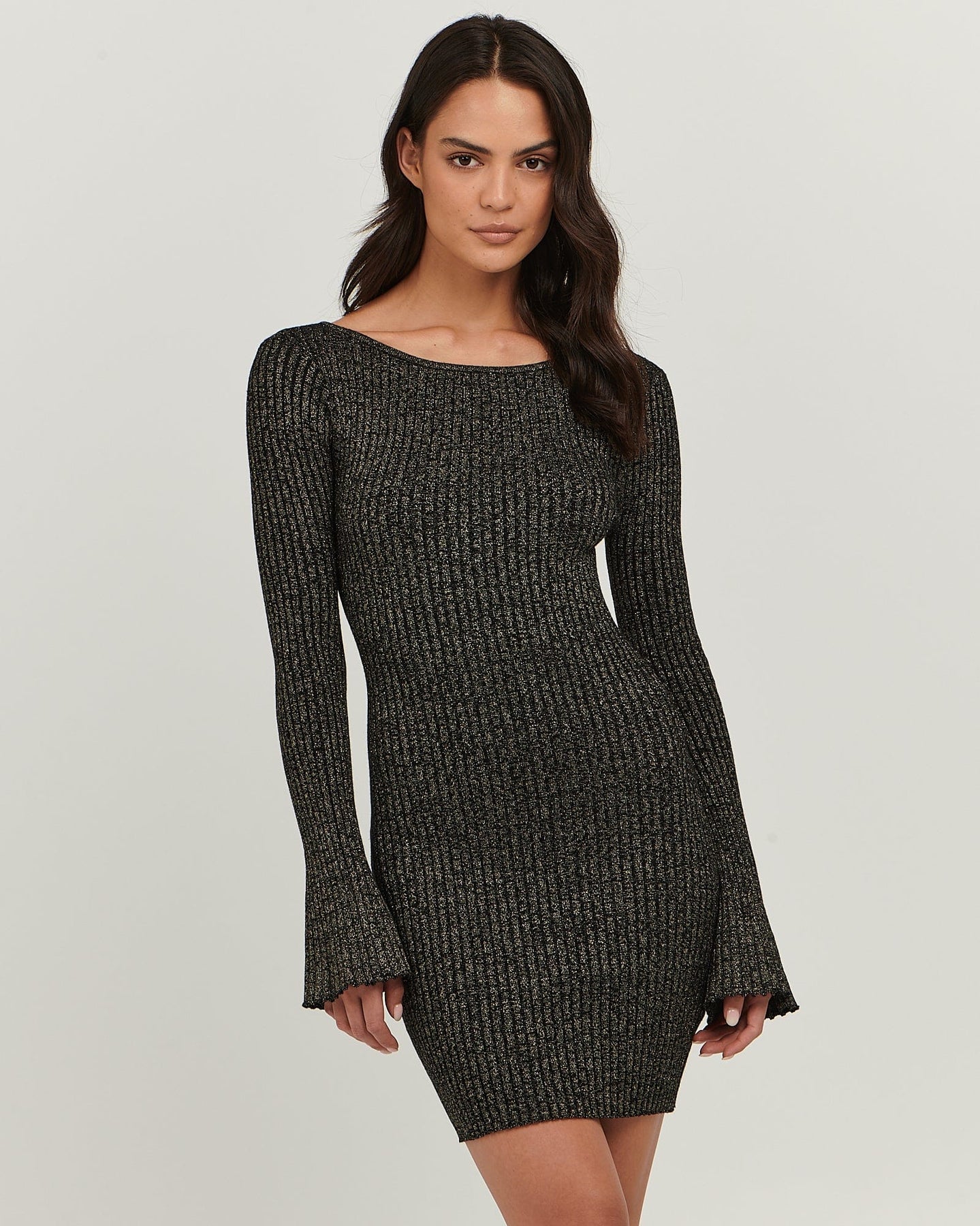 In a sparkling rib knit, this gorgeous boatneck mini dress features stunning statement sleeves. A gorgeous evening look with stilettos and a chain bag.