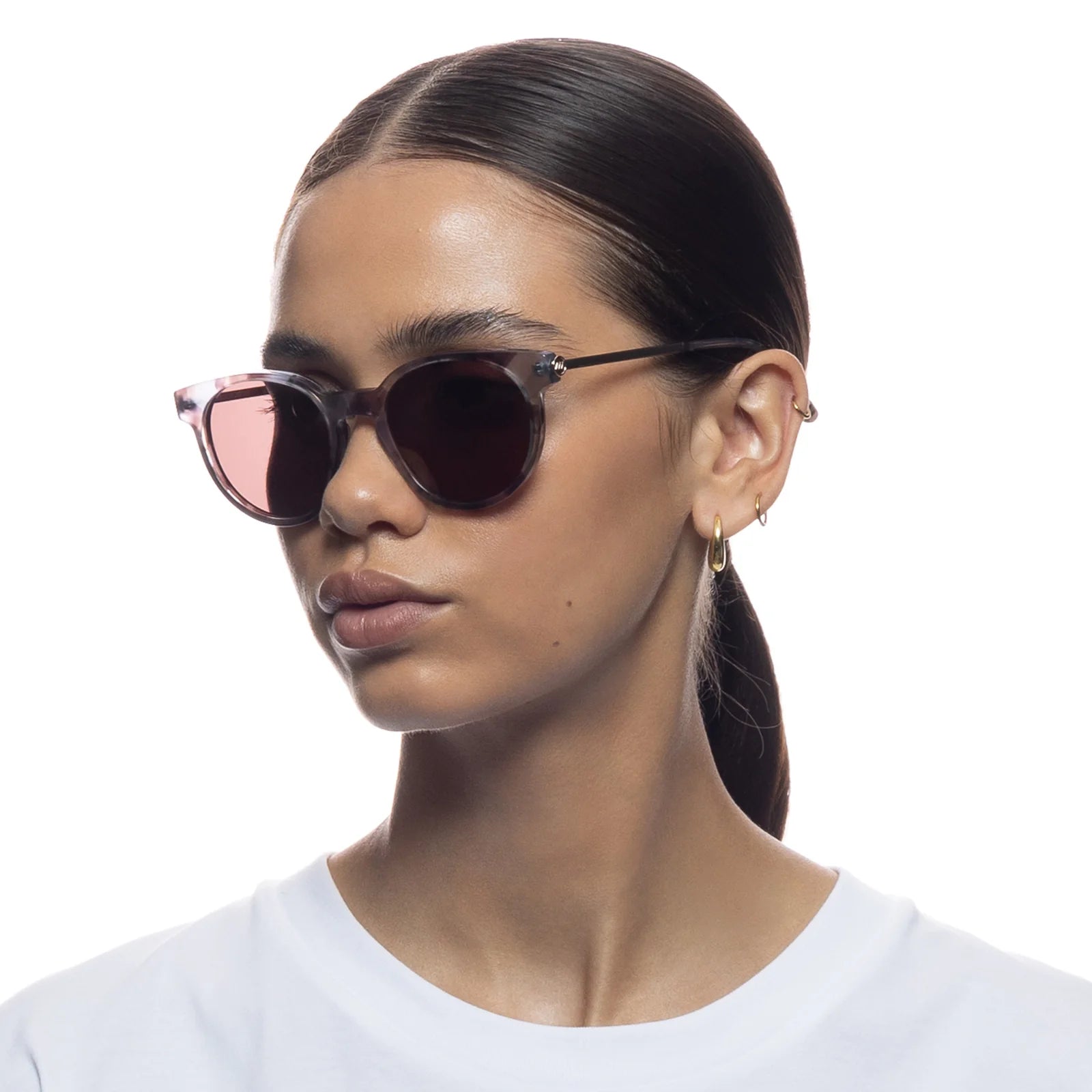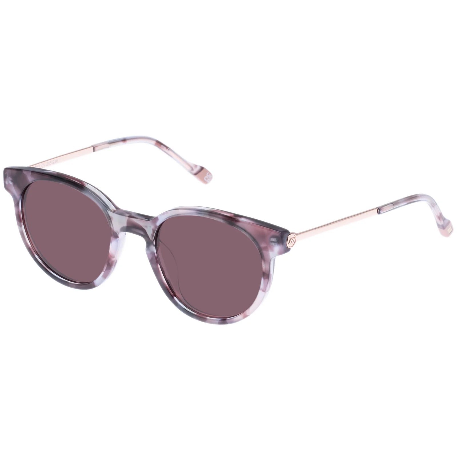 Designed with a vintage-inspired round silhouette, our BREEZY handcrafted acetate sunglasses are effortless and flattering. Offering a petite fit, this style features luxurious metal temples with disc hardware discreetly embossed with the signature Le Specs flag stripe – perfect for elevating any outfit. Crafted from bespoke grey and pastel textured tortoiseshell acetate with dark lenses.