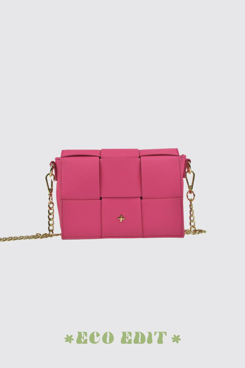 Introducing love, a mini flapover with an oversized weave and luxe gold chain strap, this bag is sure to become your next staple item. Love is part of the eco edit, made with recycled vegan leather and luxe gold hardware.