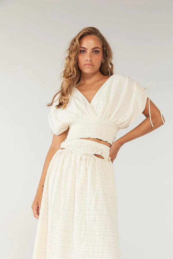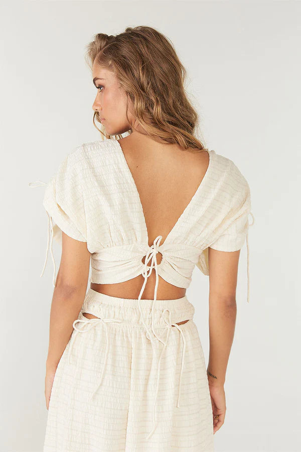 - Centre "front" bodice rouleau drawstring keyhole detail. Drawstring can also be styled as a halter neck tie.
