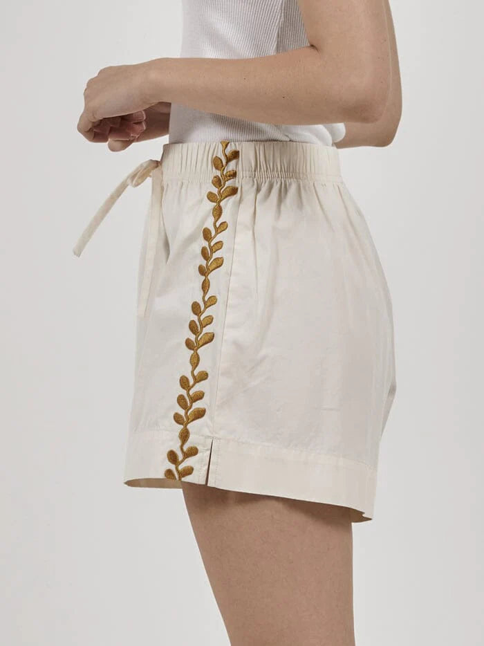 Elevated, distinct and lush, our two piece Natural Gravitation story features our short sleeve shirt and elastic waist short in a soft mid weight cotton poplin with incredibly high quality embroidery motif. These pieces can be worn as a set or separately and are the perfect balance between structure and fun.