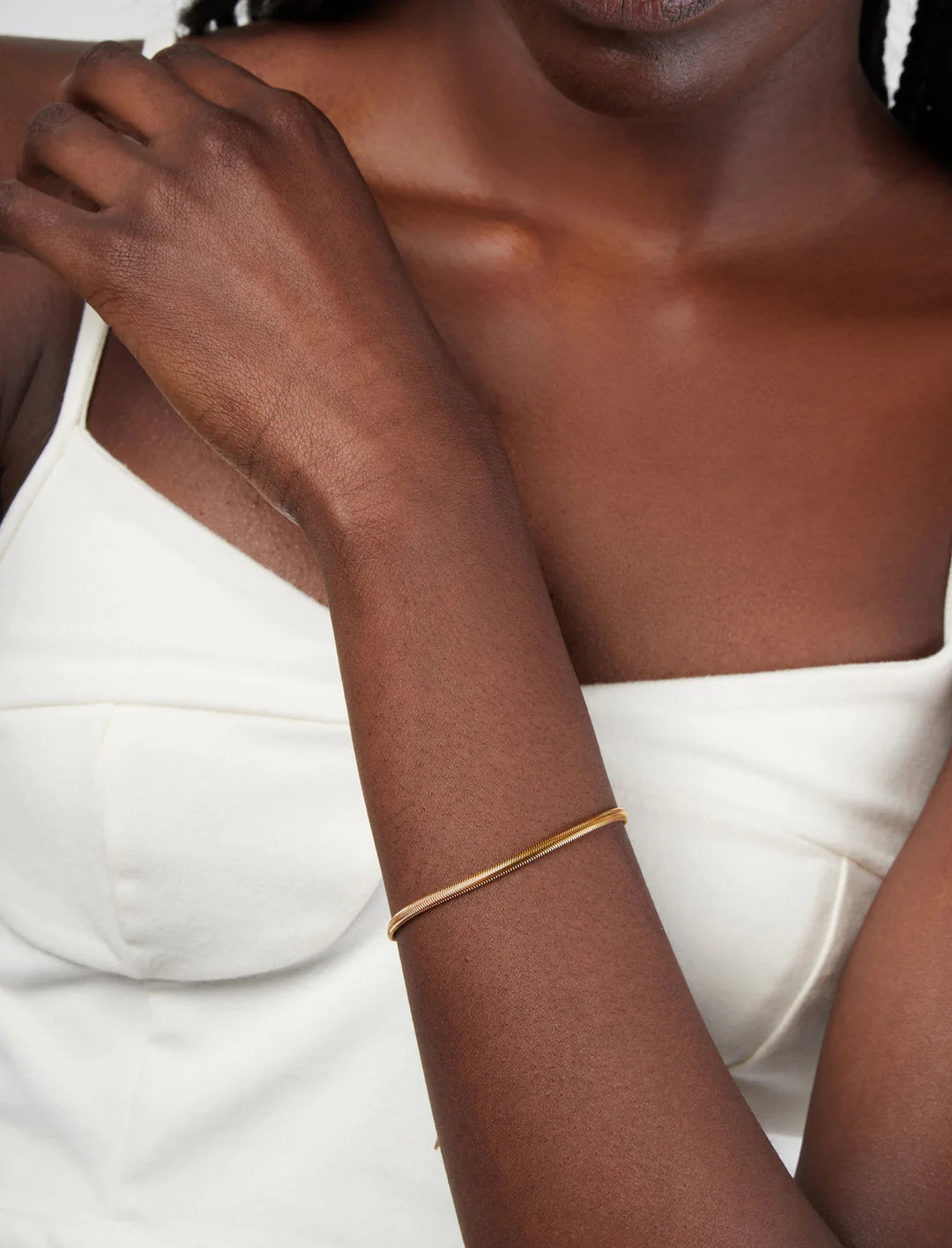 A balance of simplicity and style, the Satine Bracelet is a tasteful piece for your wrist. Designed with a wide snake chain that provides sophisticated flair, it reflects the light with every movement. Crafted from stainless steel with an IP yellow gold plated exterior for a radiant shine. Finished with a lobster clasp and polished, this bracelet is a charming piece for every day. Perfect for layering with other chains, you can also wear it alone for a clean look.