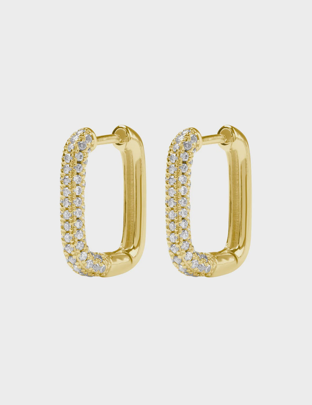 Bringing you luxury and sophistication are the Avery Hoops. Modelled in a rectangular silhouette, this pair provides a modern and clean appeal. It features delicate cubic zirconia gemstones in a pave setting, enclosing the front half in dazzling glamour. Created in sterling silver, this set is finished with a yellow gold plating for a warm lustre. Polished for a sublime beam with a huggie fastening, it is perfect for daytime outfits or evening wear. This striking set will be your new favourite go-to accessory.