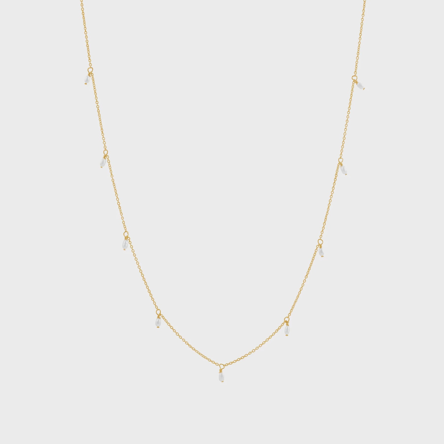 The Prim Pearl Necklace is a perfect graceful and refined accessory that is suitable for any occasion. This necklace features a fine 14k gold-filled plain chain that showcases five delicately suspended Freshwater Pearls. This piece is a minimalistic and decadent bracelet that will become an essential in your Alana Maria Jewellery collection.