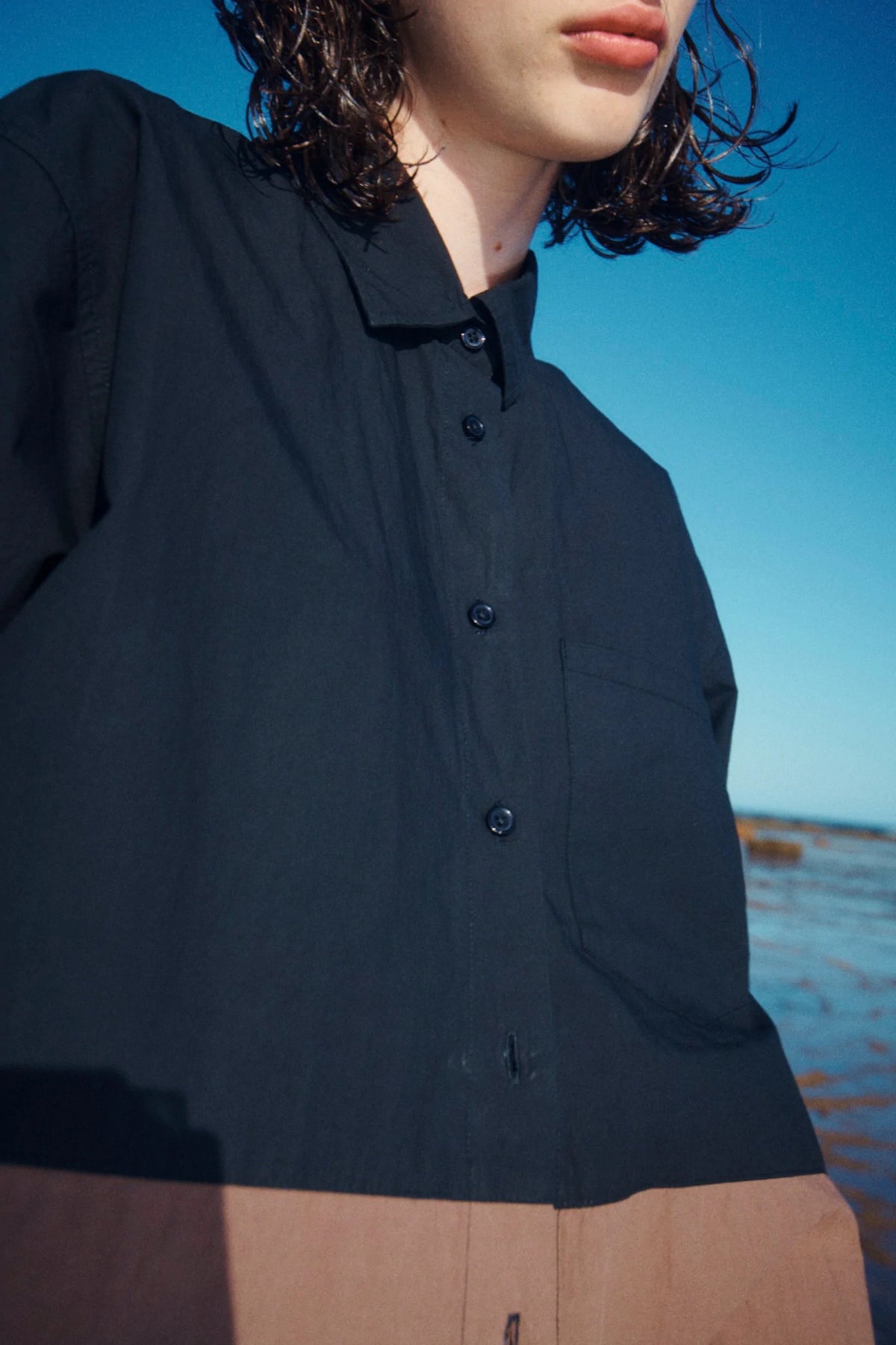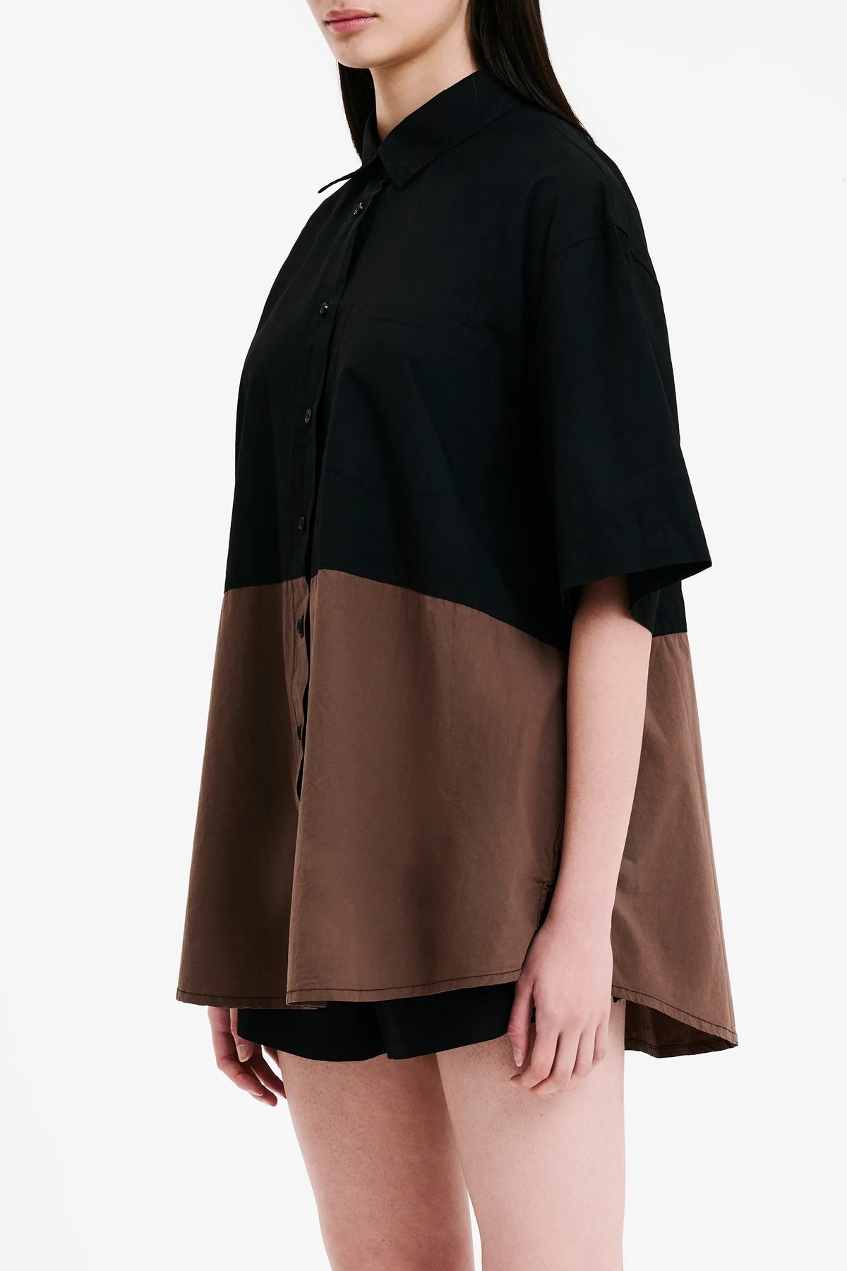 The Samson Shirt is made from our signature cotton poplin. Silhouette is oversized with wide sleeve and longline body, finishing below the hips. Features include traditional shirting details with a feature contrast panel through lower body. Pair with Samson Short for a coordinating look.