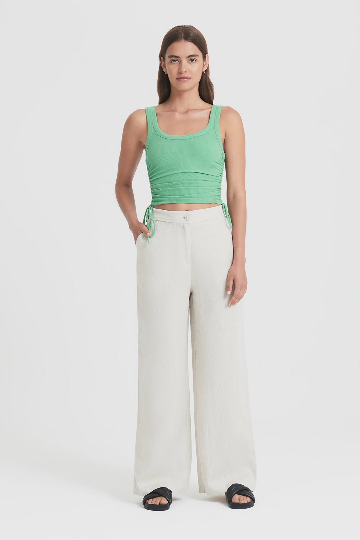 The Sima Linen Pant is cut from a premium 100% linen with a washed, breathable handfeel. Worn high on the waist, silhouette is fitted at the waist and relaxed through hip and leg. Features include a fitted waistband and functioning fly front with a shell button detail, side seam pockets and functional welt back pockets.