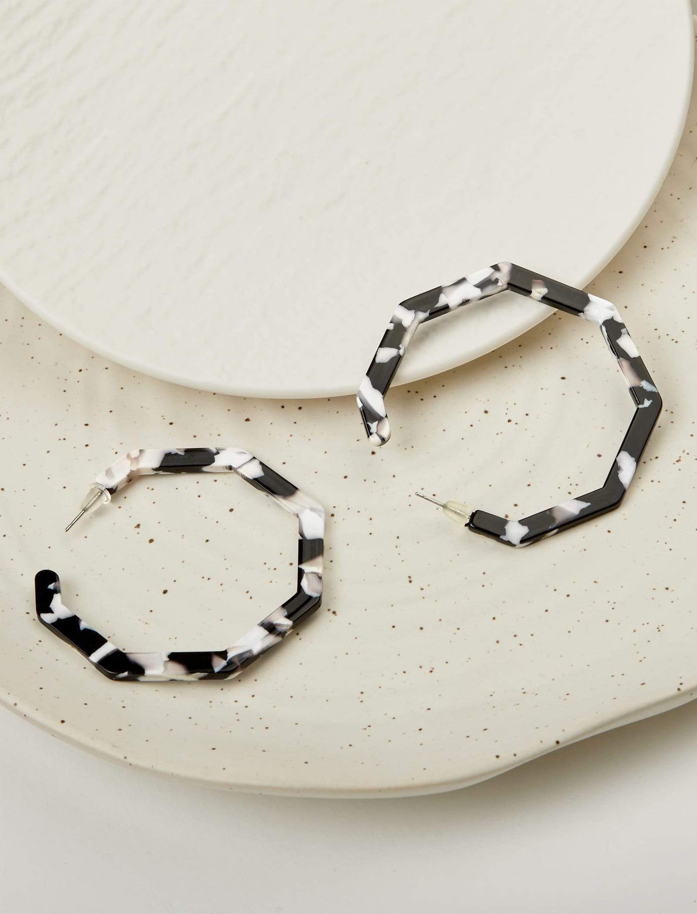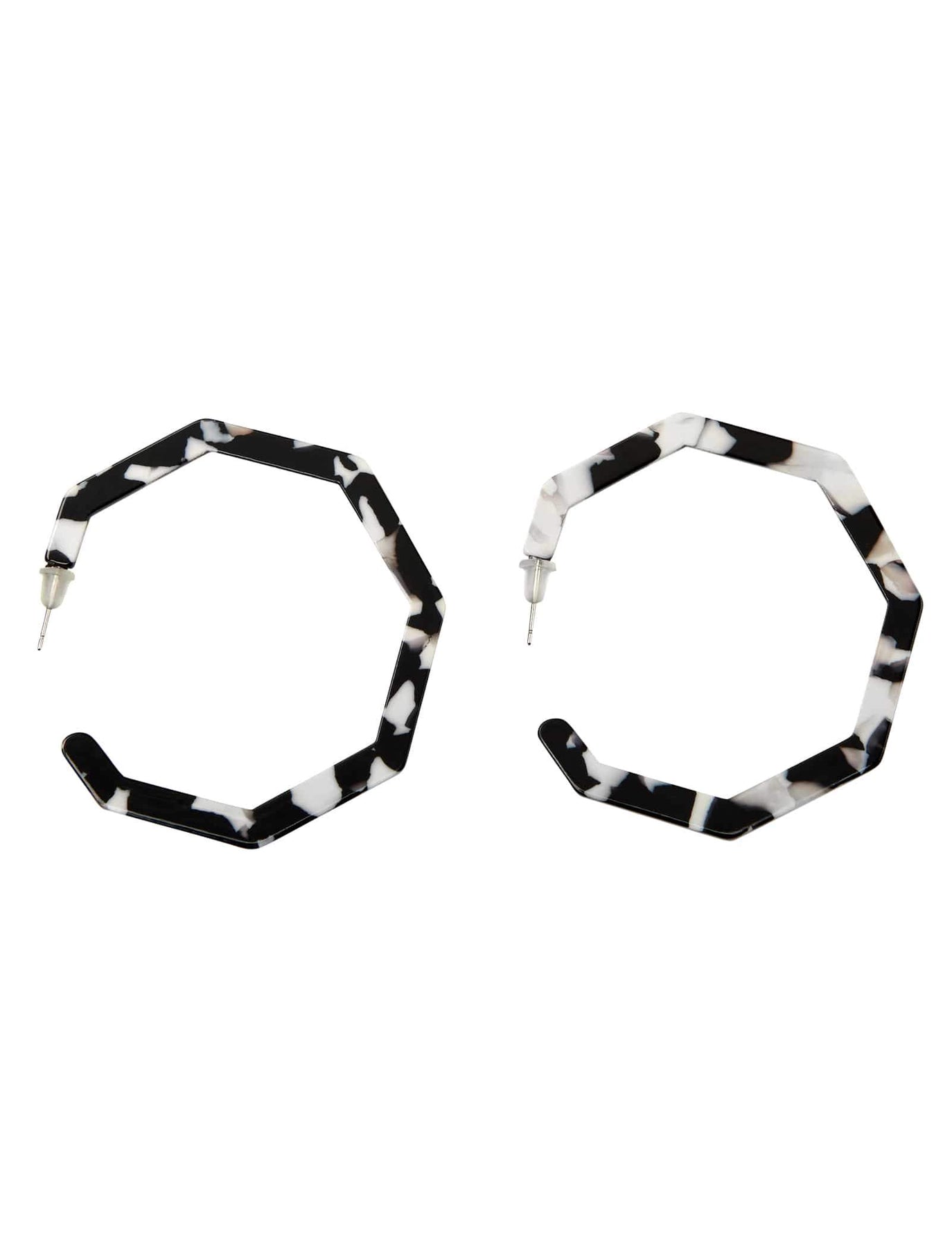 • In a unique octagon silhouette, these earrings are decorated with a stunning black and white speckle finish