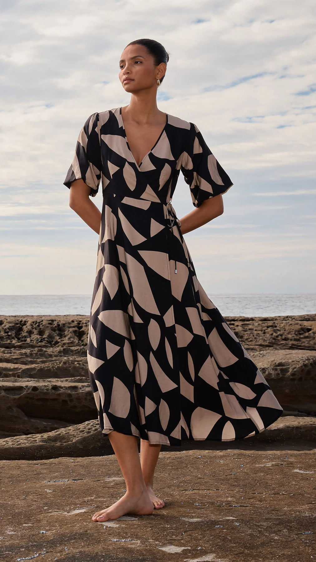 - Midi wrap dress in exclusive geometric print - True wrap style with self-fabric waist ties- V-neckline - Lined bodice - Short elasticated puff sleeves - Luxe twill fabrication with silky hand-feel - Style Number: UT2303452
