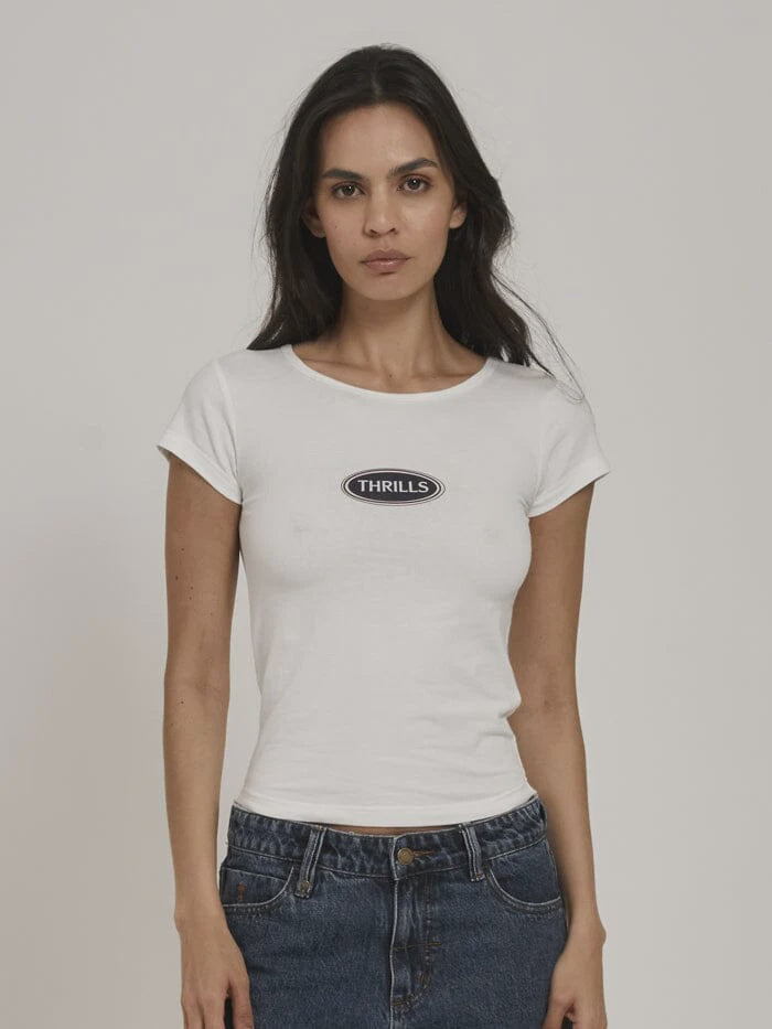 The cap sleeve design of the tee adds a touch of femininity to the design, while the oval Thrills logo in the middle adds a touch of personality and individuality. Whether you're running errands or just hanging out with friends, this tee is the ultimate choice for anyone who wants to stay comfortable while looking stylish.